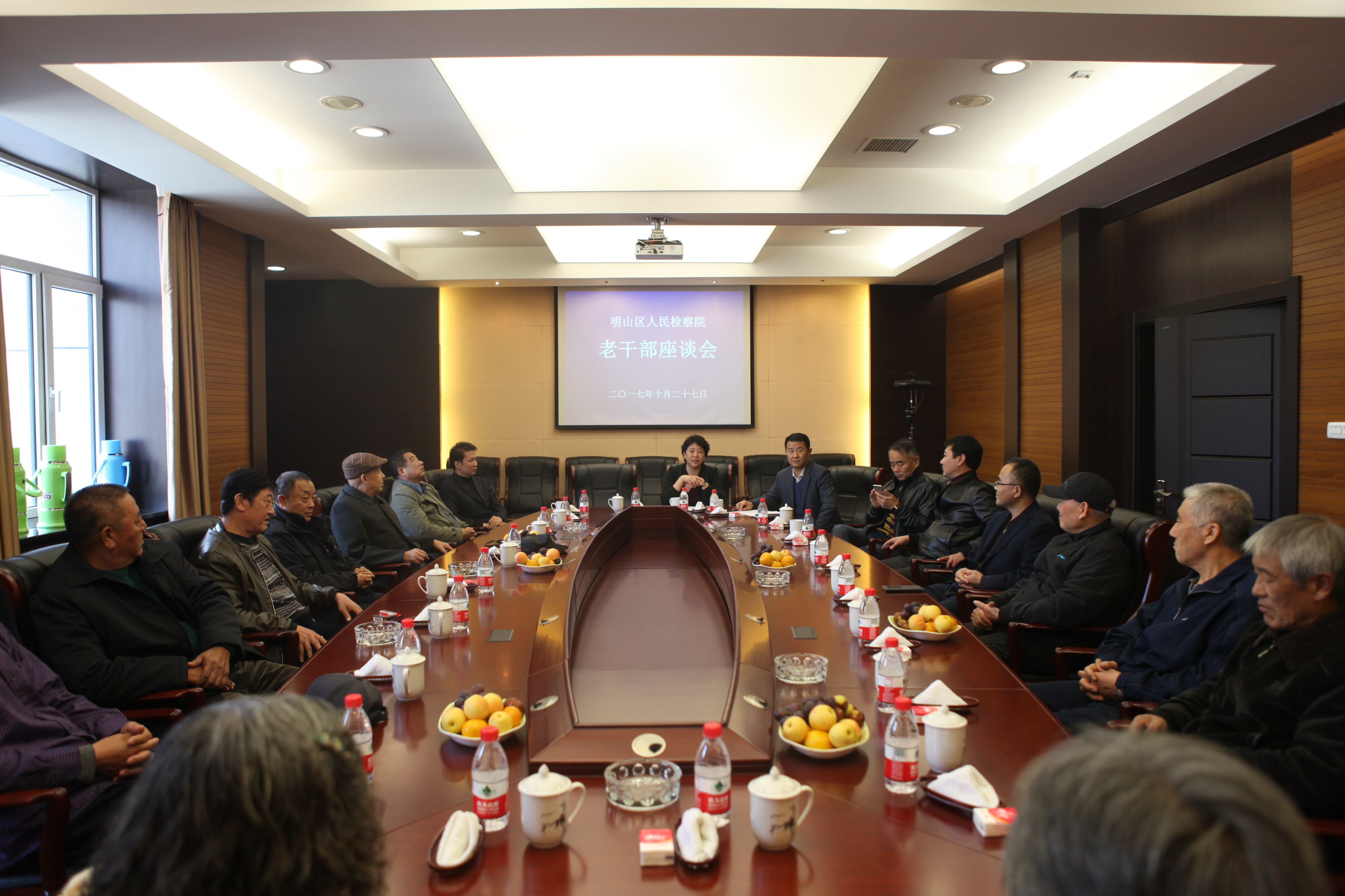 为深入学习贯彻十九大精神,大力弘扬中华民族尊老敬老的传统文化,坚定文化自信,努力营造欢乐喜庆、温馨和谐的重阳节气氛,2017年10月27日,本溪市明山区检察院邀请本院退休的老干部在院内召开座谈会,与老干部们交流思想、增进感情,共同欢庆即将到来的重阳佳节。明检院检察长卢晶,副检察长王治鸿、魏威、霍春雷等区院领导共同参加座谈。