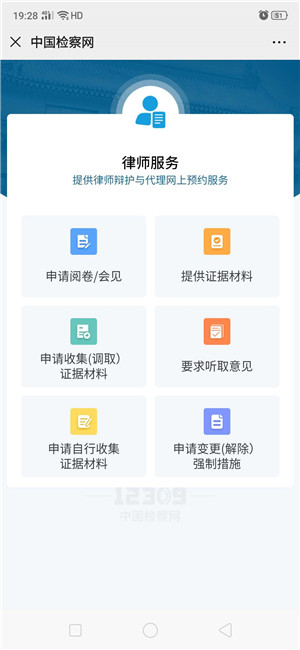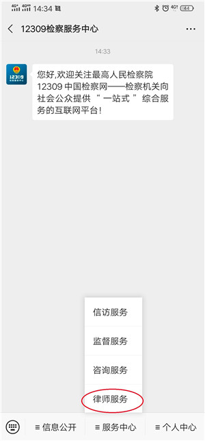 12309中国检察网是检察机关向社会公众提供”一站式”综合服务的互联网平台,设有专门的律师服务模块,为律师提供阅卷申请预约、案件进展情况查询及推送等服务。律师可登录“12309中国检察网”(www.12309.gov.cn),也可在手机上关注“12309检察服务中心”微信公众号或下载“检察12309”APP,自助进行注册和案件绑定操作。推荐使用微信公众号方式登录,具体操作方法如下: