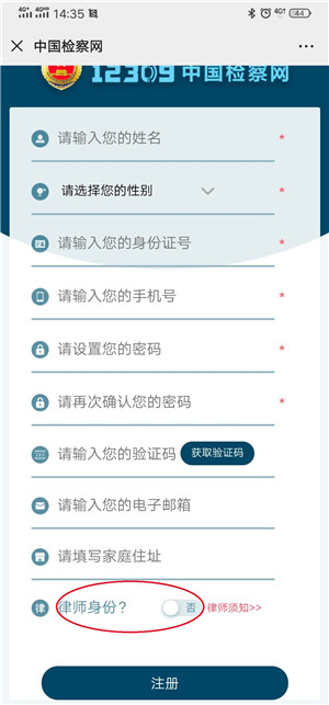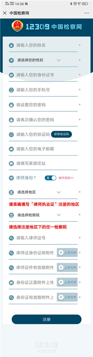 进入注册页面(如图2-4),填写姓名、手机号码等信息,获取并填写手机验证码,将“律师身份”处默认的“否”,改成“是”,原有的注册信息下方会增加律师的注册内容(如图2-5),选择相关地区和检察院,上传认证材料,点击【注册】按钮即完成注册申请。