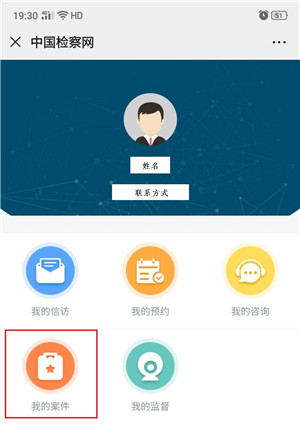 账号已审核通过的律师,可直接进入公众号对代理的案件进行绑定预约,点击“个人中心”,选择“我的12309”(图3-1),进入“我的12309”页面后,点击“我的案件”(图3-2),会显示律师代理的案件情况。