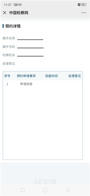 在“个人中心”选择“我的12309”,点击“我的预约”,可以查看预约事项处理情况(如图5-5)。检察院对律师提交的预约申请审核完成后,系统向律师发送短信通知,律师可登录12309中国检察网“个人中心”查看审核结果。