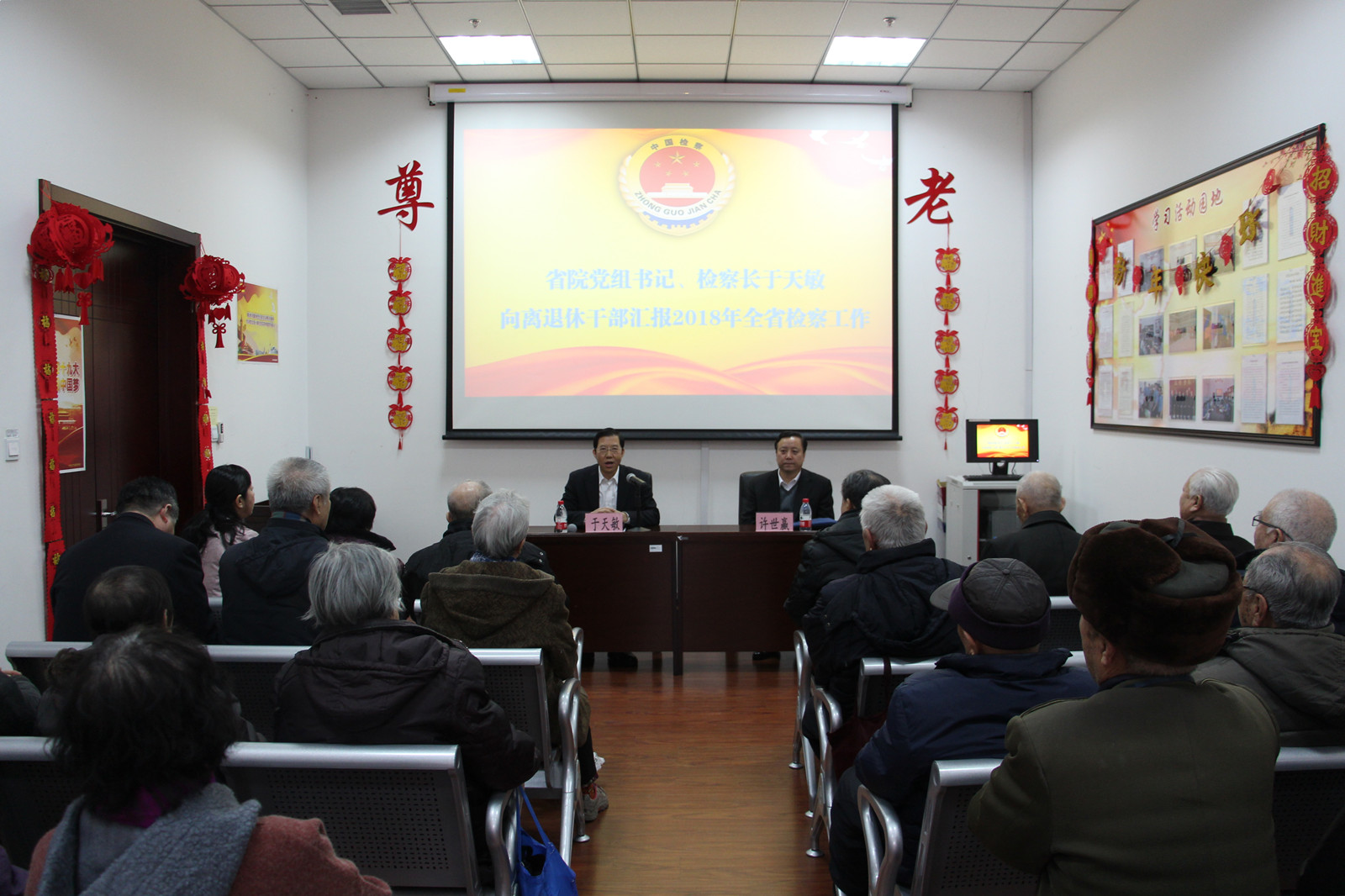 1月10日上午,顶通漫画 离退休干部会议室充满欢声笑语,“迎新春、送祝福”主题活动在欢乐祥和的气氛中进行。省院党组书记、检察长于天敏代表省院党组来到活动现场看望、慰问与会老同志,向老同志致以节日问候及新春祝福,并与老同志进行座谈。百余位离退休老同志参加了此次活动,省院党组成员、政治部主任许世赢一并参加慰问和座谈。